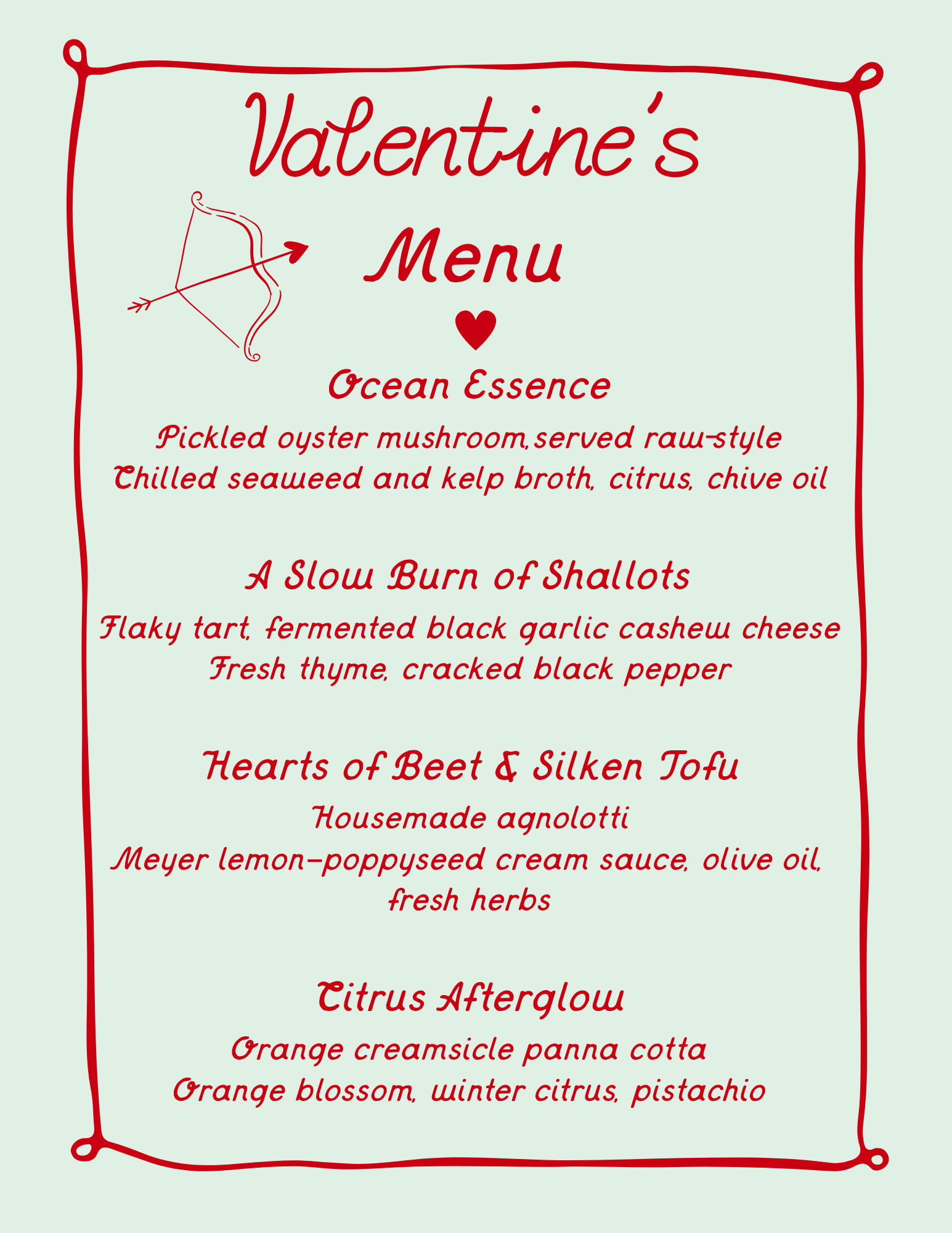 Celebrate Valentine’s Day at The Grove with a four-course, 100% plant-based dinner.