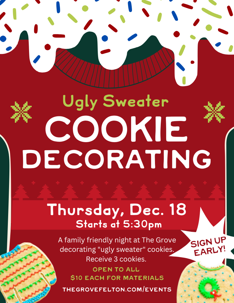 Get ready for some sweet holiday fun at The Grove! Join us for a community Ugly Sweater Cookie Decorating night December 18th at 5:30 PM. It's a family-friendly evening filled with creativity and festive treats as kids decorate their own cookies.